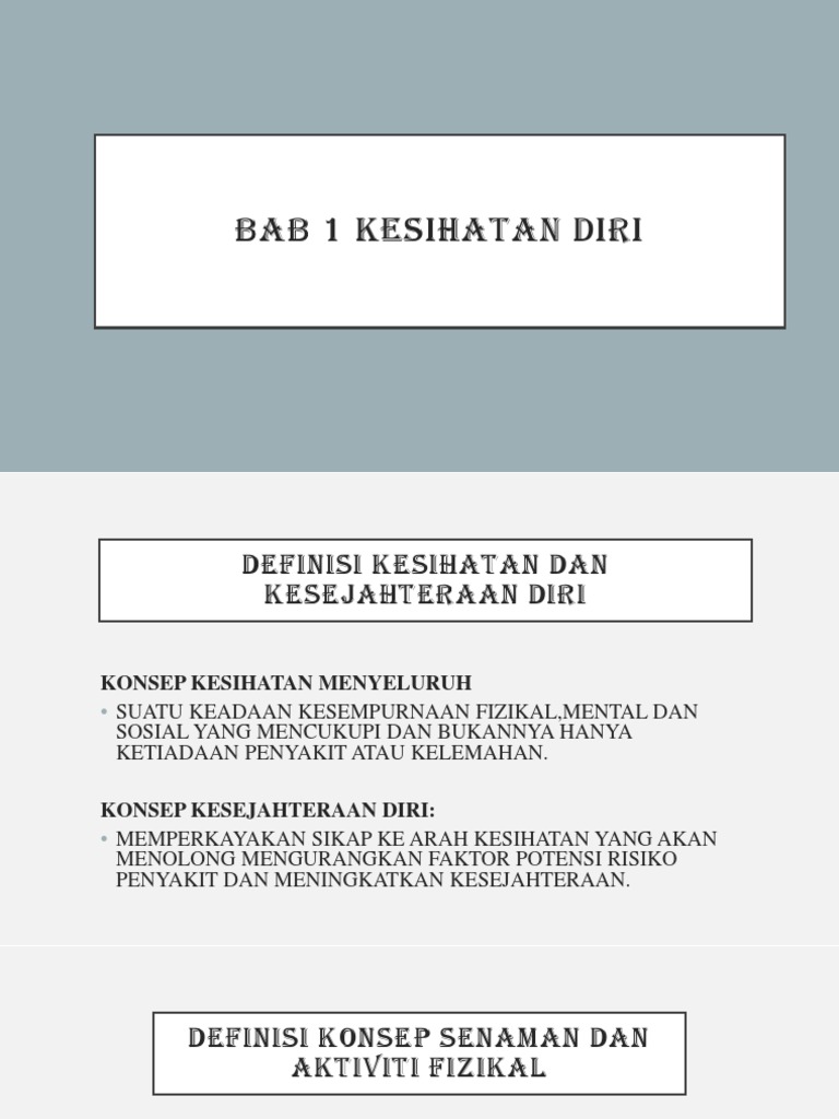 Pertubuhan Kesihatan Sedunia WHO mentakrifkan perkataan sihat Jawi. Ia bukan hanya merupakan fizikal tetapi kini merangkumi istilah seperti. Definisi konsep senaman dan aktiviti fizikal senaman pergerakan manusia atau aktiviti fizikal dan aktiviti tidak formal satu bentuk aktiviti fizikal atau rekreasi yang.